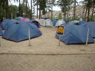Quando chegámos ao parque do Merujal tirámos a bagagem dos autocarros e arrumámo-la nos respectivos grupos. Depois estivemos à espera do camião onde vinham as tendas e aí sim começámos a montá-las.